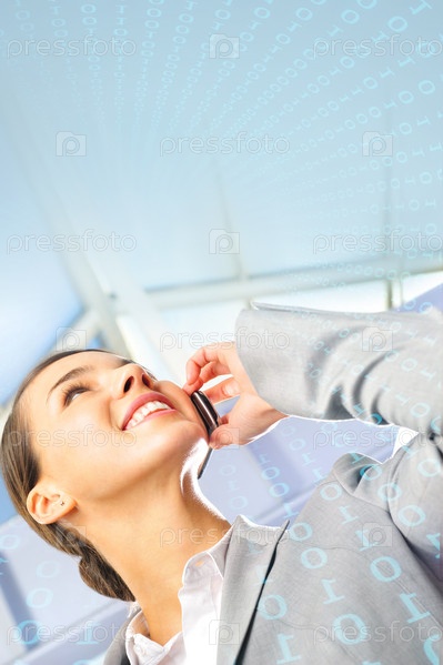 Портрет красивой бизнес-леди с телефоном в современном здании