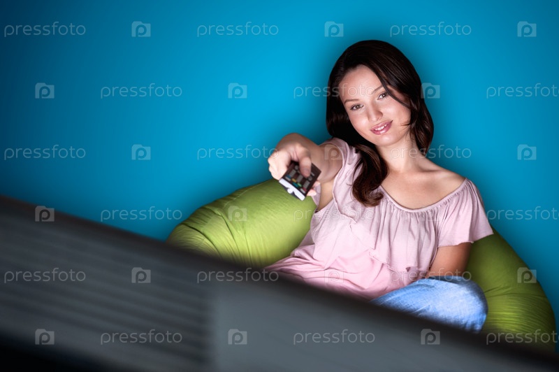 Молодая женщина смотрит телевизор дома
