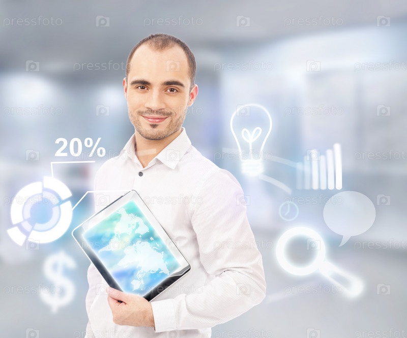 Деловой мужчина с компьютером и различными иконками вокруг