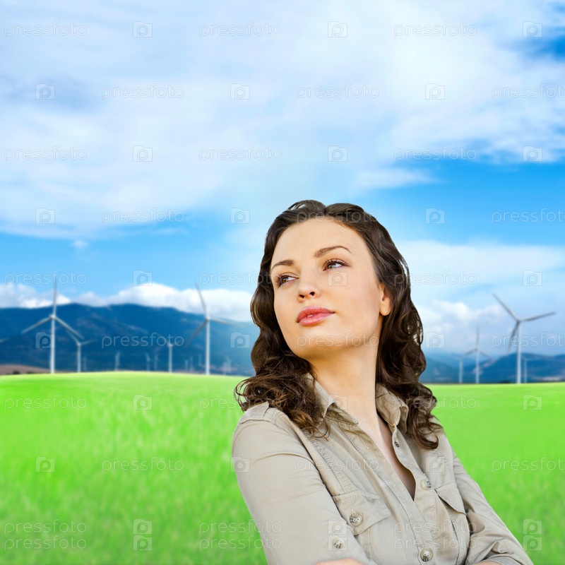 Симпатичная женщина стоит в красивой сельской местности. Концепция экологичных технологий