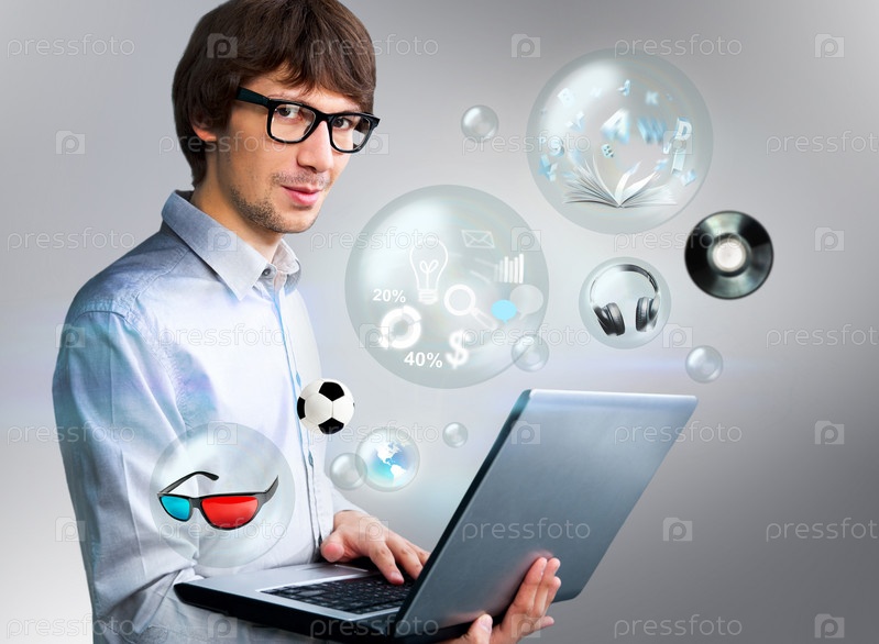 Взрослый красивый мужчина держит планшетный компьютер с иконками различных объектов вокруг. Все мультимедиа в одном мобильном гаджете