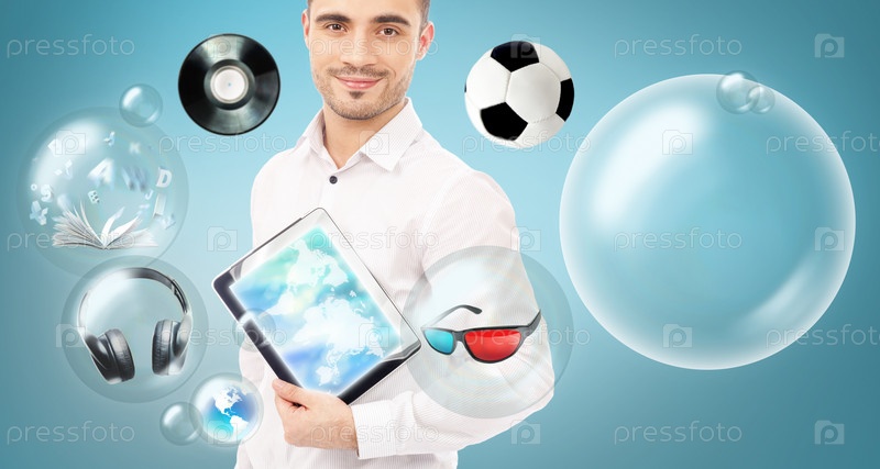 Взрослый мужчина с планшетным компьютером и различными иконками вокруг него