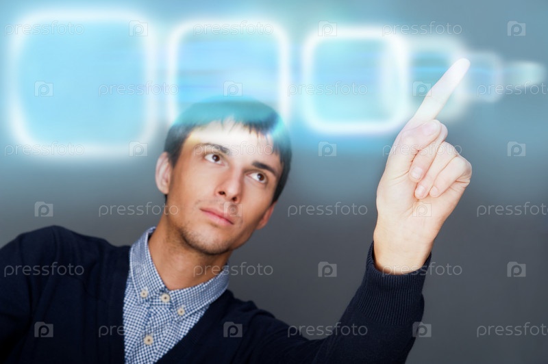 Деловой человек работает на современном компьютере с виртуальным интерфейсом. Слияние технологий