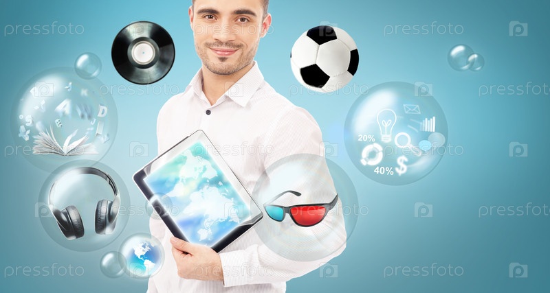 Взрослый мужчина с планшетным компьютером и различными иконками вокруг него