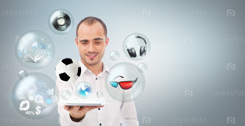 Взрослый красивый мужчина держит планшетный компьютер с иконками различных объектов вокруг. Все мультимедиа в одном мобильном гаджете