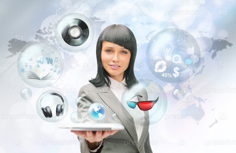 Симпатичная деловая женщина держит планшетный компьютер с иконками различных объектов вокруг. Все мультимедиа в одном мобильном гаджете
