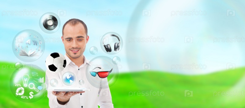 Взрослый красивый мужчина держит планшетный компьютер с иконками различных объектов вокруг. Все мультимедиа в одном мобильном гаджете