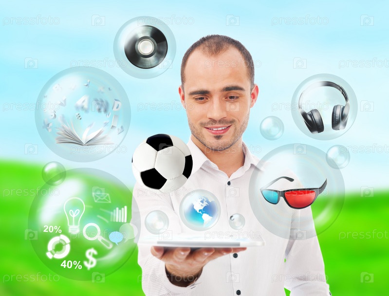 Взрослый красивый мужчина держит планшетный компьютер с иконками различных объектов вокруг. Все мультимедиа в одном мобильном гаджете
