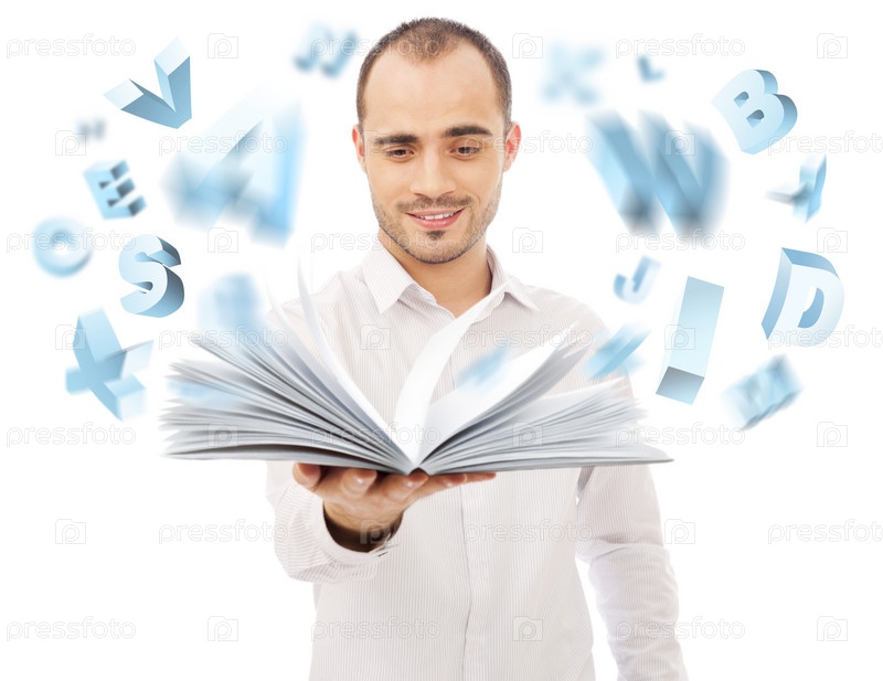 Взрослый мужчина с открытой книгой, различные буквы вылетают из нее