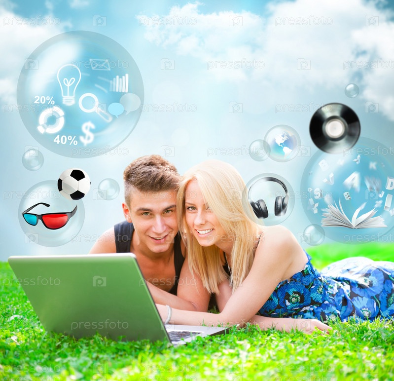 Портрет молодых людей на зеленой траве с ноутбуком и вылетающими из него символами