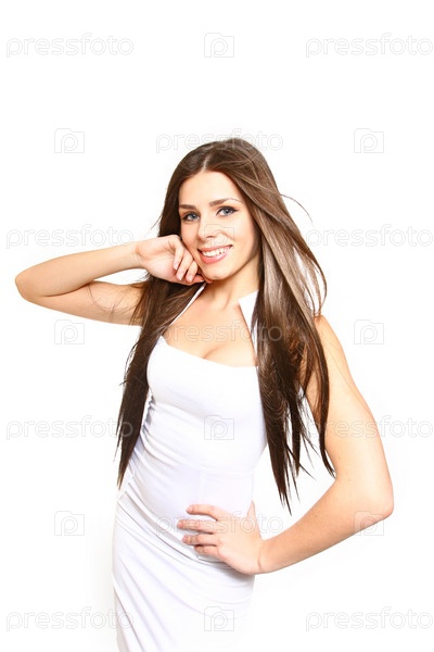 Счастливая молодая женщина в элегантном платье на белом фоне