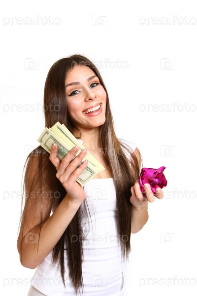 Счастливая молодая женщина позирует с копилкой и долларами на белом фоне крупным планом