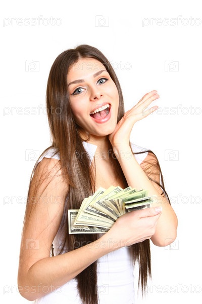 Счастливая молодая женщина позирует с долларами на белом фоне крупным планом