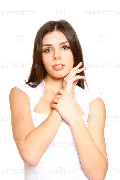 Привлекательная молодая женщина в белом платье позирует на белом фоне