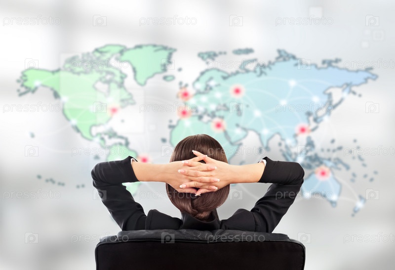 Привлекательная брюнетка сидит перед картой мира с горящими точками