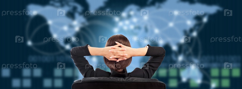 Молодая брюнетка в футуристическом интерфейсе сидит перед картой мира с горящими точками и линиями соединения