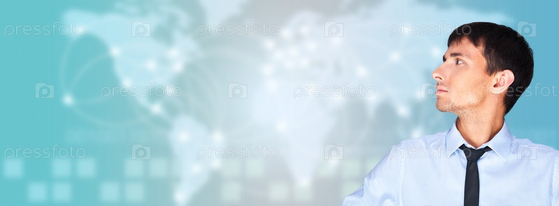 Мужчина, держащий планшетный компьютер на фоне карты мира с серверными точками и линиями связи