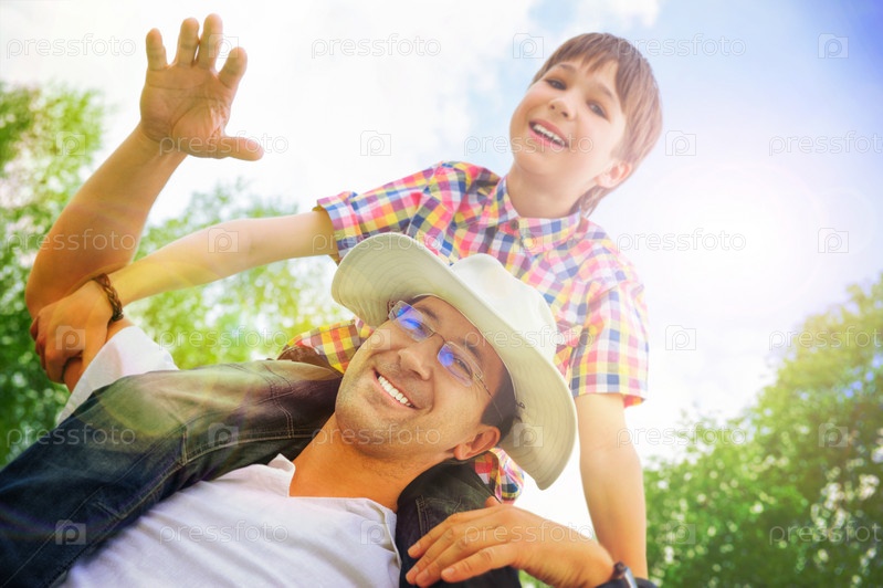 Портрет улыбающегося отца несет сына на плечах на фоне неба