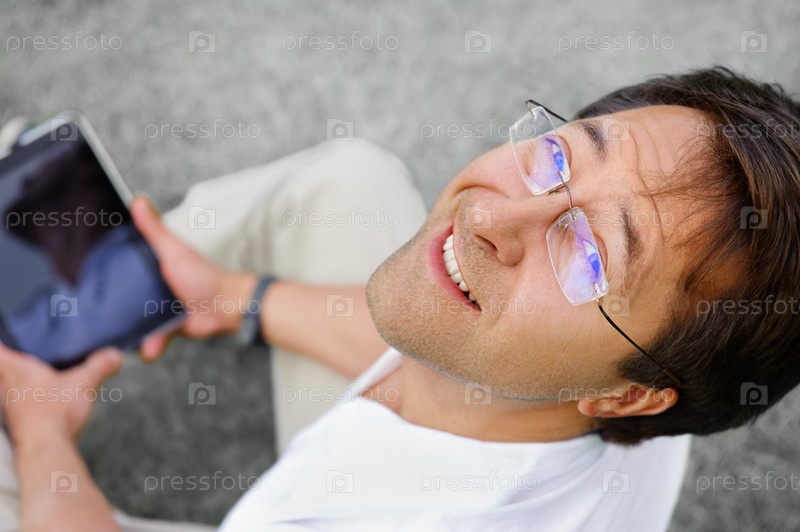 Красивый добродушный мужчина использует интернет на планшете