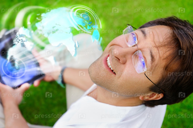 Мужчина использует планшетный компьютер, чтобы забронировать гостиницу и билеты для командировки или отдыха и читает международные новости, сидя на траве в парке