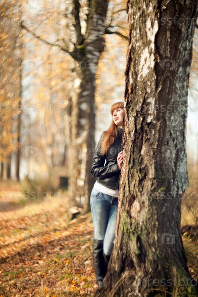 Молодая рыжеволосая женщина в осеннем парке возле березы с размытым фоном