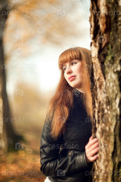 Молодая рыжеволосая женщина в осеннем парке возле березы с размытым фоном