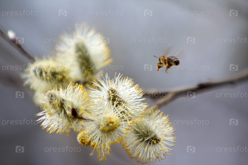 Пчела на цветущей ветке вербы в лесу весной