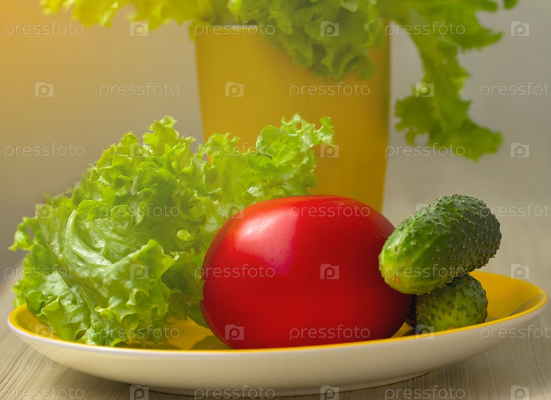 Листья салата, помидор и огурцы на тарелке
