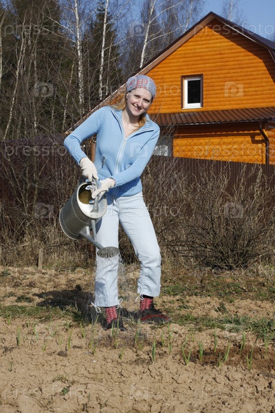 Женщина поливает грядку с чесноком