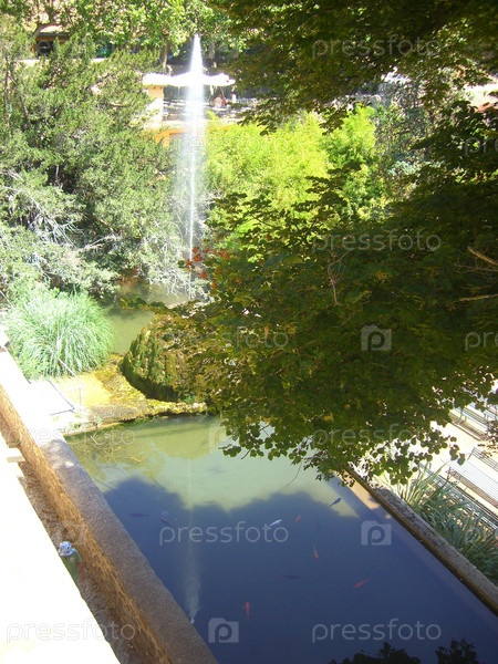 Испания, о. Мальорка. Бассейн с золотыми рыбками и фонтаном у горного замка на севере острова