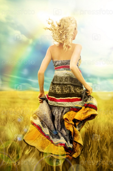 Романтическая женщина в красивом платье бежит через поле