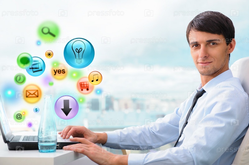 Деловой человек с ноутбуком в офисе и различными иконками вокруг