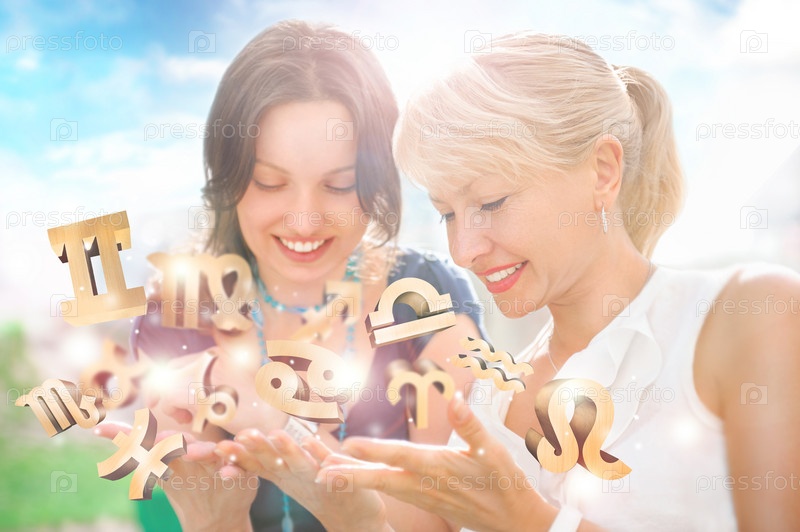 Мать и дочь в летнем парке с различными знаками зодиака