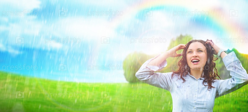 Молодая женщина на открытом воздухе под дождем на фоне красивого пейзажа
