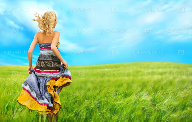Романтическая женщина бежит через поле