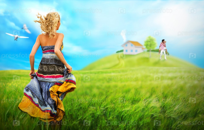 Молодая женщина бежит через поле к дому ее мечты. Концепция ипотечного кредитования
