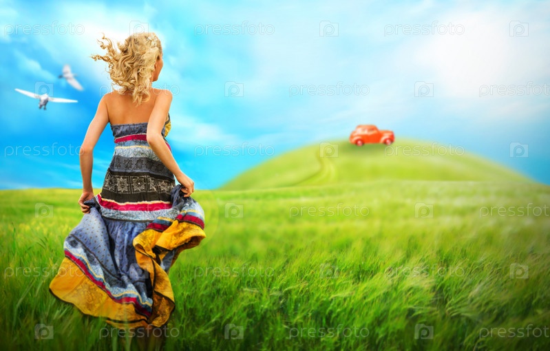 Молодая женщина бежит через поле к автомобилю. Концепция автокредита