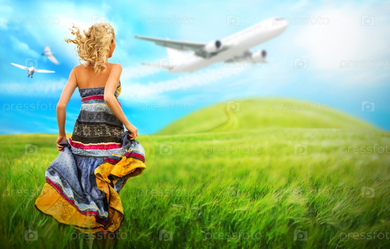 Молодая женщина бежит через поле с птицами и самолетом над головой. Концепция путешествия