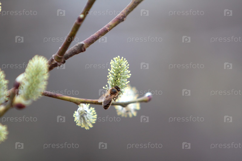 Пчела на цветущей ветке вербы в лесу весной