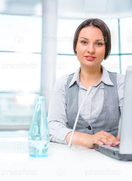 Улыбающаяся деловая женщина с микрофоном