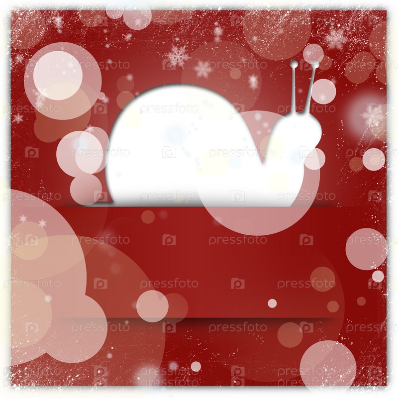 Белая улитка на красном фоне со снежинками