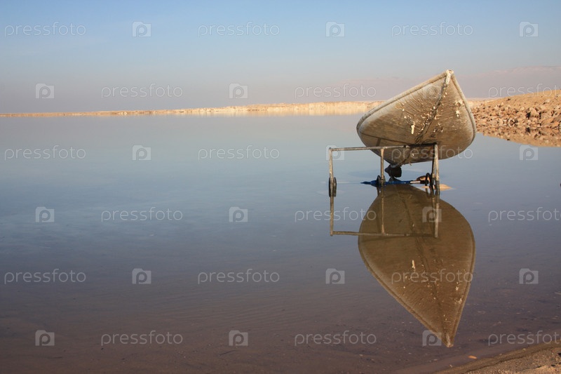 Лодка, отражающаяся в зеркальной поверхности Мертвого моря в Израиле
