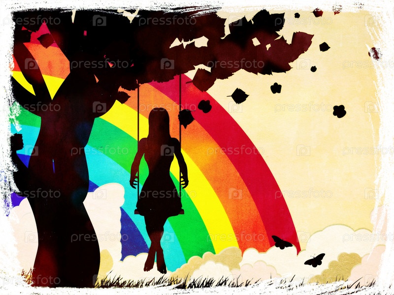 Гранж девушка на качелях и радуга