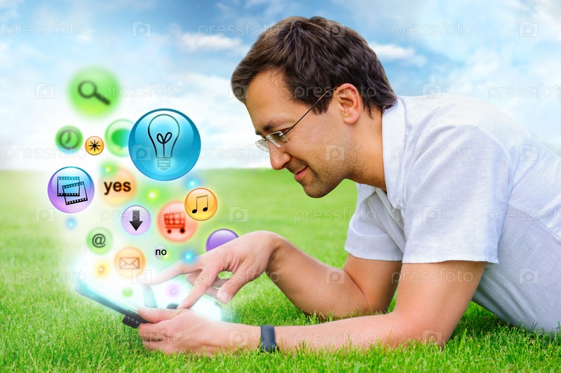 Мужчина использует планшетный компьютер в сельской местности. Различные иконки появляются из сенсорного экрана
