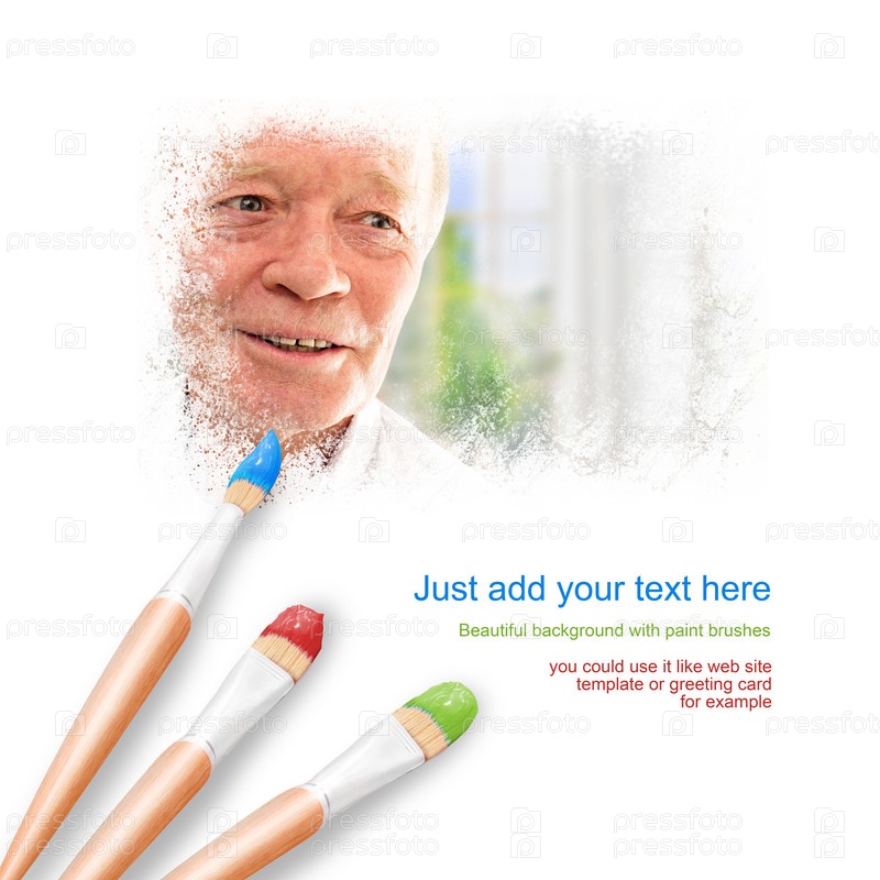 Белый фон с тремя кистями и портрет счастливого пожилого мужчины