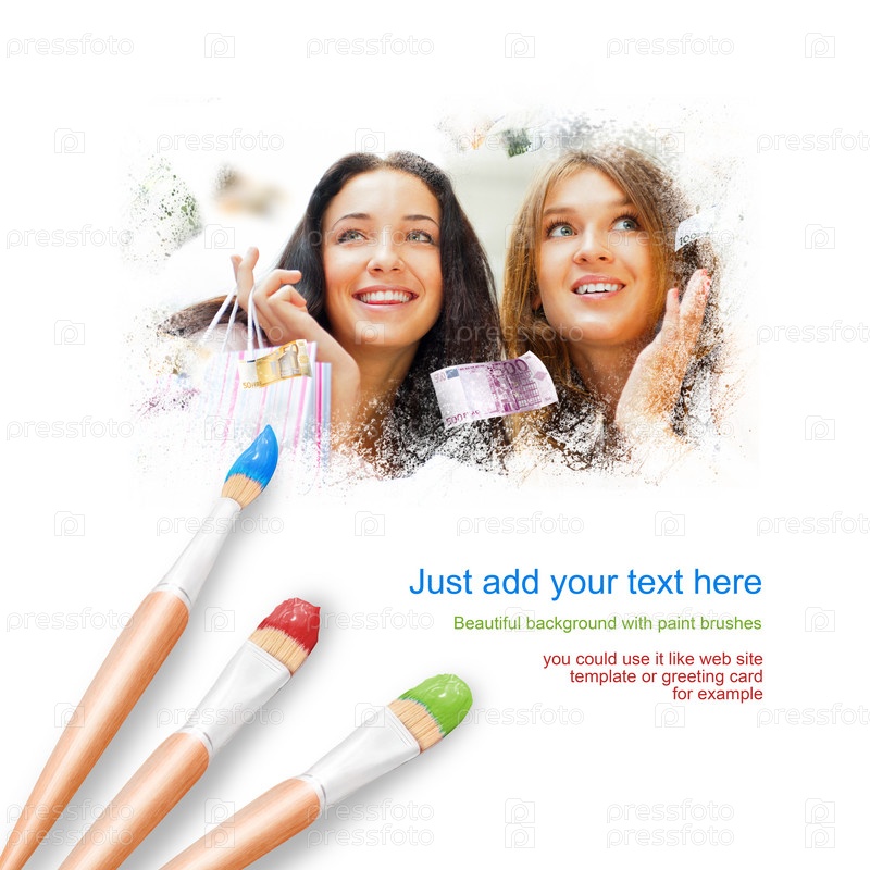Белый фон с тремя кистями и портрет двух красивых молодых женщин с сумками