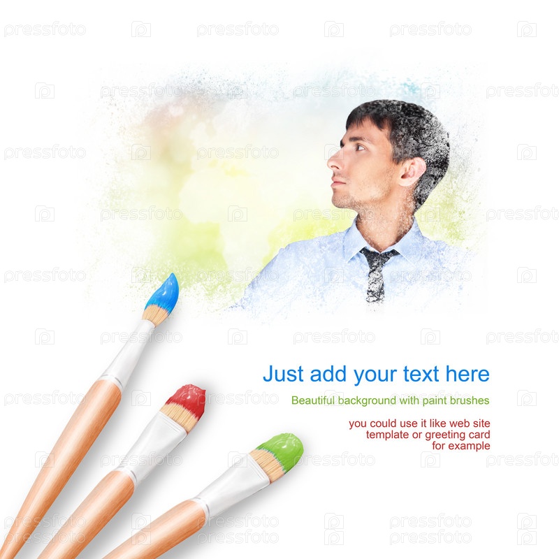 Белый фон с тремя кистями и портрет успешного красивого бизнесмена