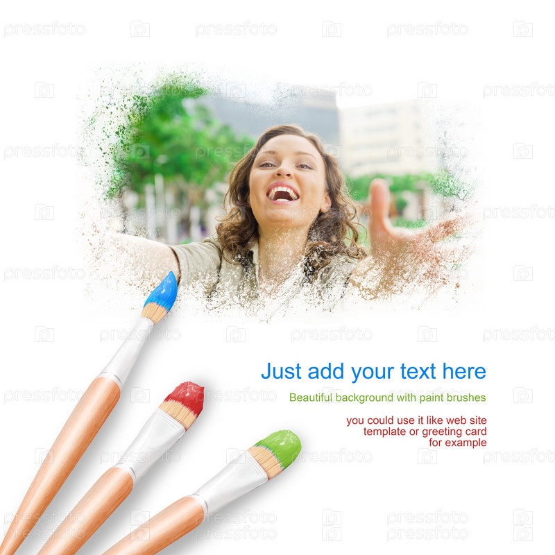 Белый фон с тремя кистями для рисования, портрет красивой молодой женщины на открытом воздухе
