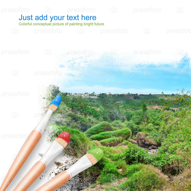 Белый фон с тремя кистями и красивым пейзажем