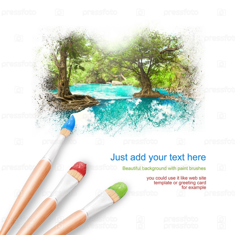 Белый фон с тремя кистями для рисования, красивый пейзаж